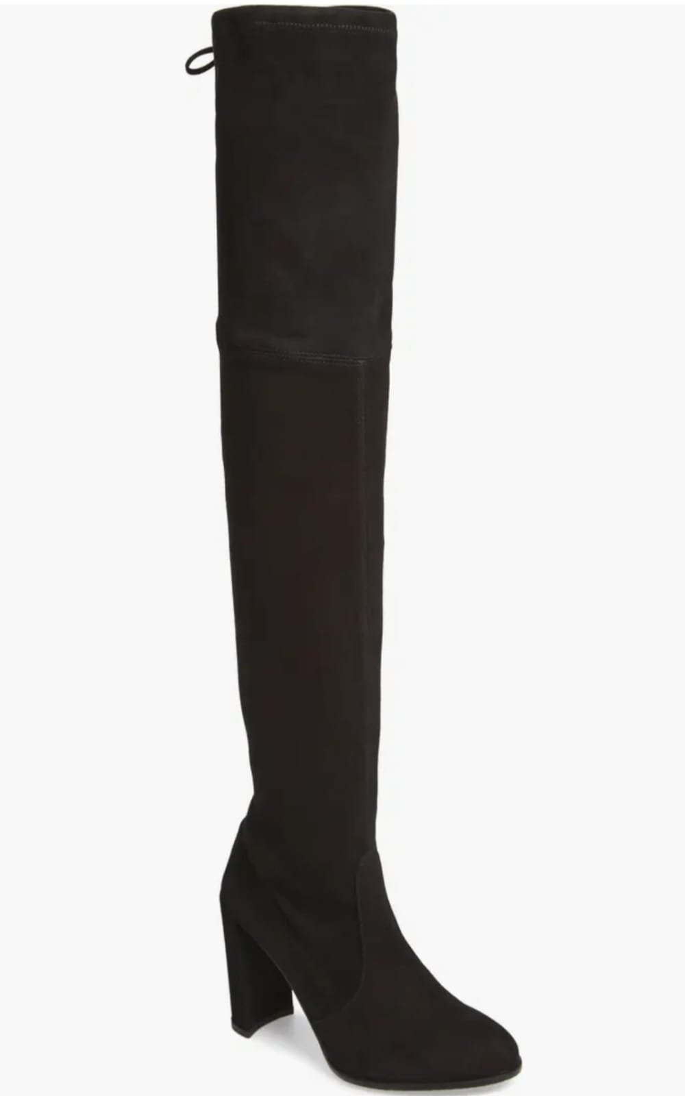 A soaring over-the-knee shaft that’s nearly thigh high is secured by drawstring ties on a glove-soft, goatskin-leather boot lifted by a curved half-moon block heel. Color(s): anthracite suede, black nappa, black suede, currant suede, denium suede stretch, nero plonge stretch, nice blue suede, nutmeg suede, praline suede, slate suede, topo suede. Brand: STUART WEITZMAN. Style Name: Stuart Weitzman Hiline Over The Knee Boot (Women). Style Number: 5416438. Available in stores.